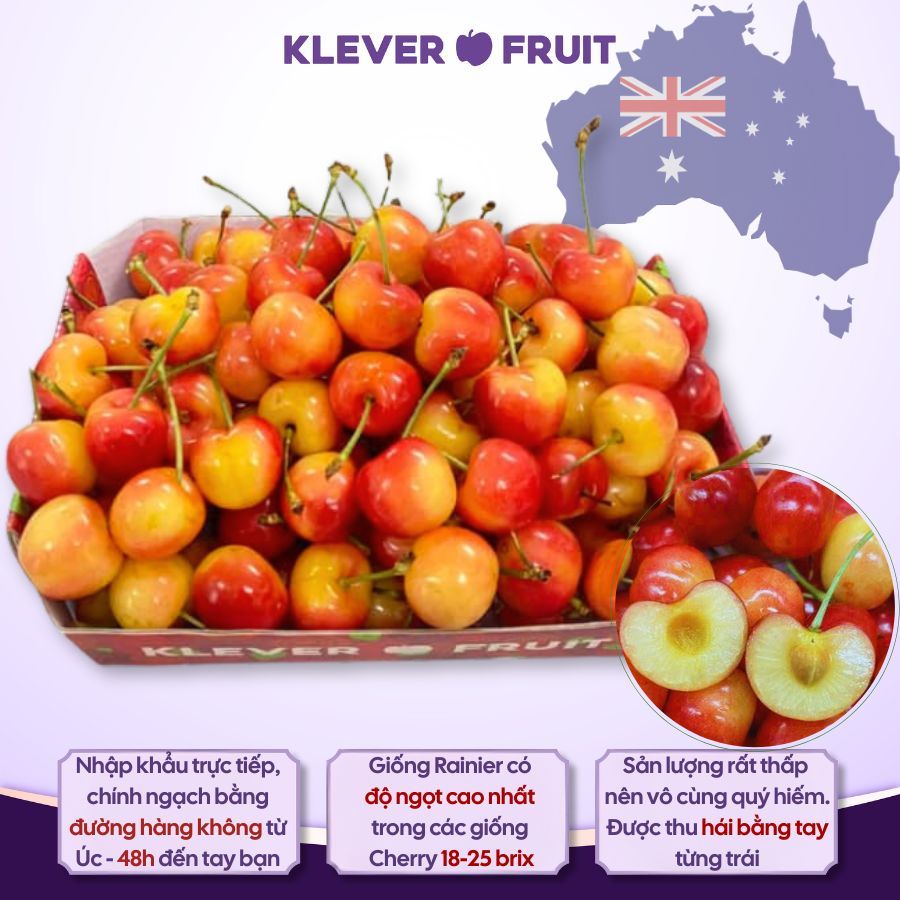 Cherry Vàng Jumbo Úc là minh chứng cho cam kết của Klever Fruit: mang đến trái cây nhập khẩu chất lượng cao nhất, định nghĩa chuẩn mực sang trọng tại Việt Nam. Hãy thử ngay để thưởng thức hương vị độc đáo hoặc chọn làm quà tặng tinh tế cho những người thân yêu!