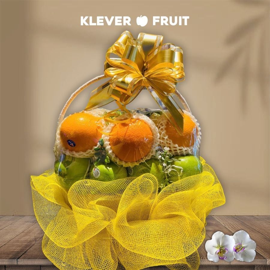 Giỏ Trái Cây Tone Vàng Với Cam Vàng Úc Mix Táo Xanh