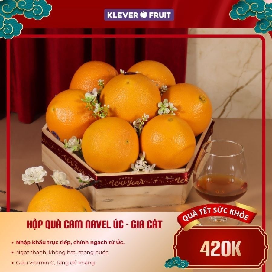 Cam Vàng Úc là món quà sức khỏe hoàn hảo với hàm lượng vitamin C dồi dào, giúp tăng cường hệ miễn dịch. Đây là lời chúc sức khỏe an khang dành cho gia đình bạn trong năm mới.