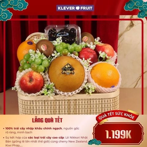 Tổng thể tạo nên một lẵng hoa quả hài hòa về màu sắc, cân đối về hương vị và giàu giá trị sức khỏe – đúng tinh thần Tết Khởi An của Klever Fruit.