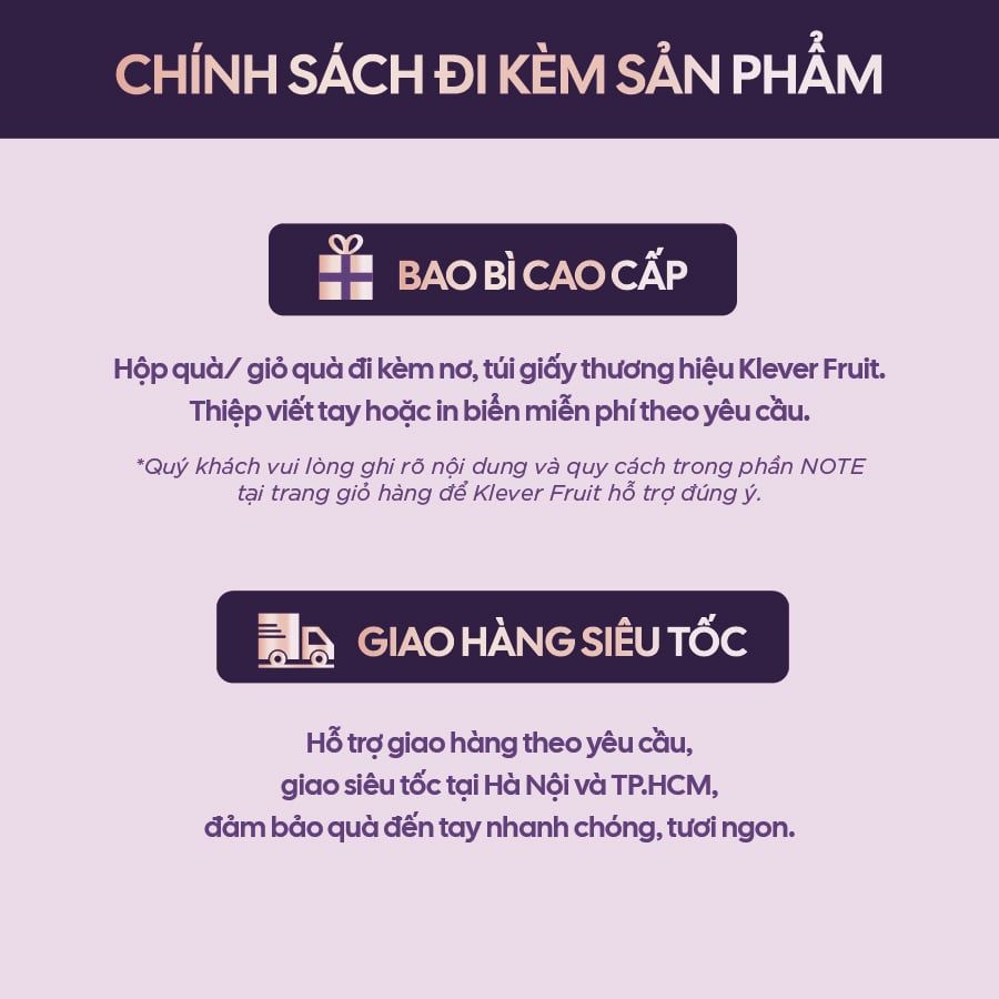 Bao bì cao cấp: Hộp quà đi kèm nơ, túi giấy thương hiệu Klever Fruit, thiệp viết tay hoặc in biển miễn phí theo yêu cầu. Quý khách vui lòng ghi rõ nội dung và quy cách trong phần NOTE tại trang giỏ hàng để Klever Fruit hỗ trợ đúng ý.