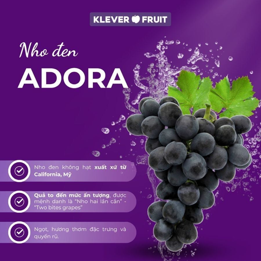 Klever Fruit là hệ thống trái cây nhập khẩu hàng đầu Việt Nam, cam kết mang đến nho Adora Mỹ chính hãng, tươi ngon và đảm bảo chất lượng.